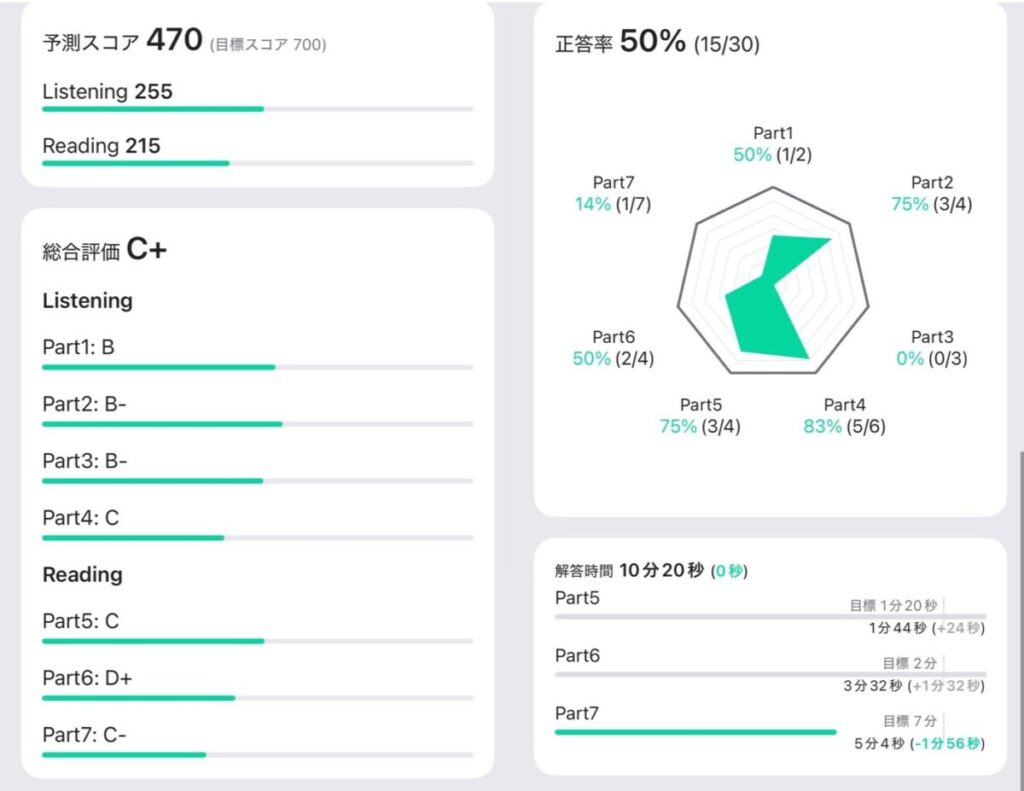 したがって、次回は60分のリーディング模試に挑戦して、時間配分と”読み切る体力”を作る。また、Part7で38%はまだまだ伸びしろ。語彙と文脈把握を強化すれば、もっと上がると思う。