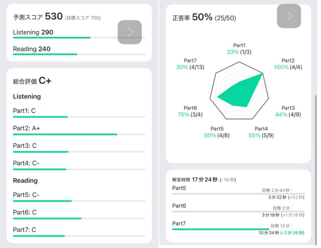 このように、15日目は同じ30分・50問で再計測。27/50(約580)まで伸びた。「なんとなく選ぶ」から「根拠を持って選ぶ」に近づいた実感がある。